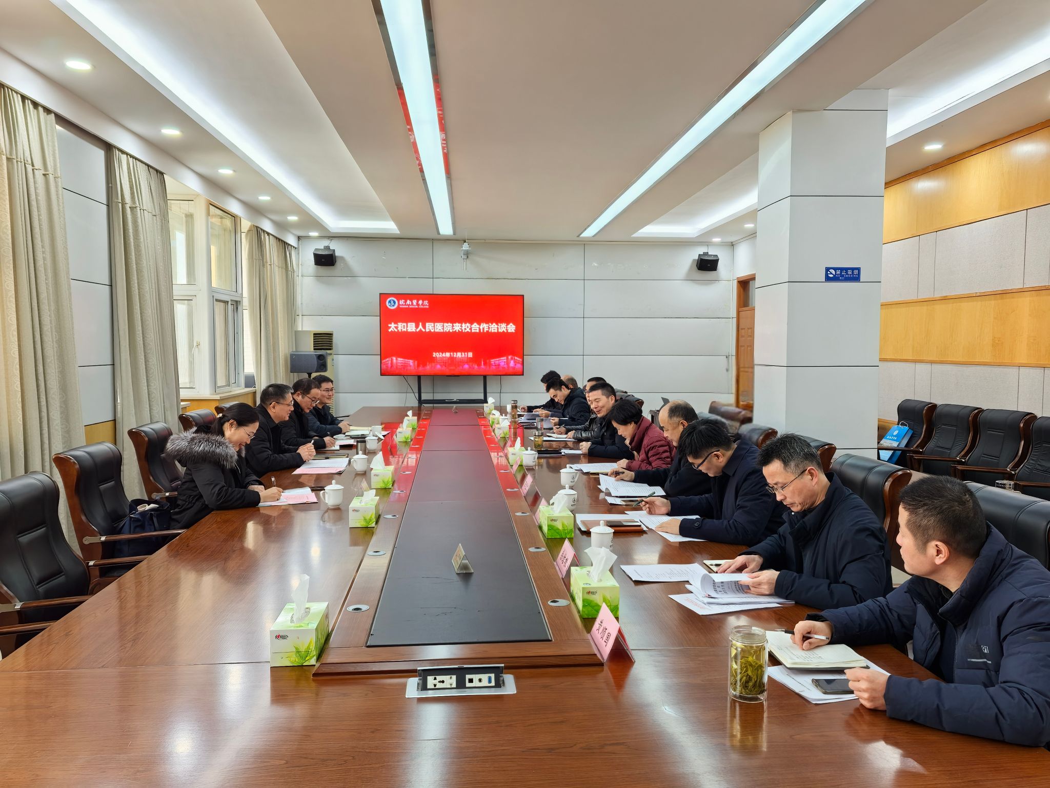 为进一步强化附属医院内涵建设,12月31日上午,太和县人民医院一行来我校洽谈深入合作,党委副书记、院长姚应水,党委副书记贾贤燕,党委常委、副院长文育锋出席洽谈会。会议由姚应水主持。