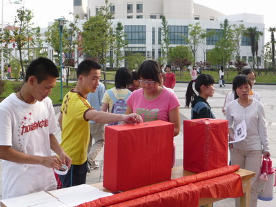 5月12日,四川省汶川县发生7.8级强烈地震,汶川、北川、绵阳等地人民生命财产遭受了重大损失。一方有难,八方支援,灾难无情人有情。5月14日,药学系07级制药工程专业学生自发组织起来,带动了全系学生共同参与,在校园内,广大学生伸出援助之手,奉献一份爱心;同时,在市区步行街、美食街、嘉信茂广场设立募捐台,学生的爱心举动得到了积极响应,广大市民踊跃捐资,帮助灾区人民共度难关。仅14日晚,各募捐点共筹集爱心捐款已超过万元。