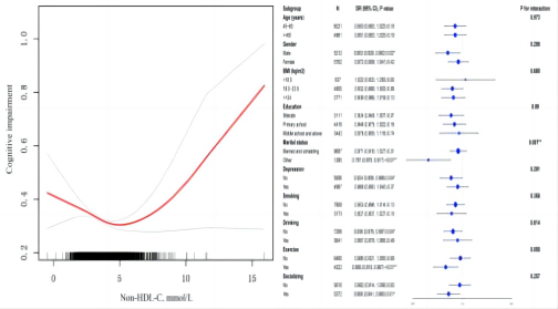 血脂水平也被认为是认知功能障碍的一个重要风险因素。本研究基于一项横断面调查研究揭示中国中老年人群非高密度脂蛋白胆固醇(Non-HDL-C)水平与认知能力之间的相关性。研究结果显示,Non-HDL-C水平与认知障碍风险呈现出一种“U”型关系,在拐点4.83 mmol/L之前,Non-HDL-C水平的适度增加与认知障碍风险的降低相关;然而,一旦超过这一拐点,Non-HDL-C水平的继续增加则与认知障碍风险的增加呈现正相关。Non-HDL-C水平较低和较高都会增加中老年人出现认知障碍的风险。这一发现为未来认知障碍的预防和干预策略提供了新的视角,强调了在血脂管理中寻求平衡的重要性。
